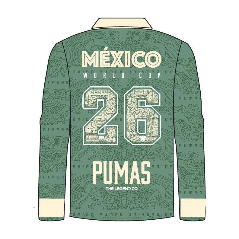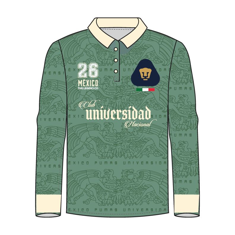 Inspirado en Pumas y en la esencia del Mundial en México. Con esta pieza reinterpretamos lo clásico con una visión contemporánea. El verde profundo no es solo color: es narrativa. En él vive un patrón detallado inspirado en los murales del Estadio Olímpico de CU, integrando arte, cultura y fútbol en una sola prenda.